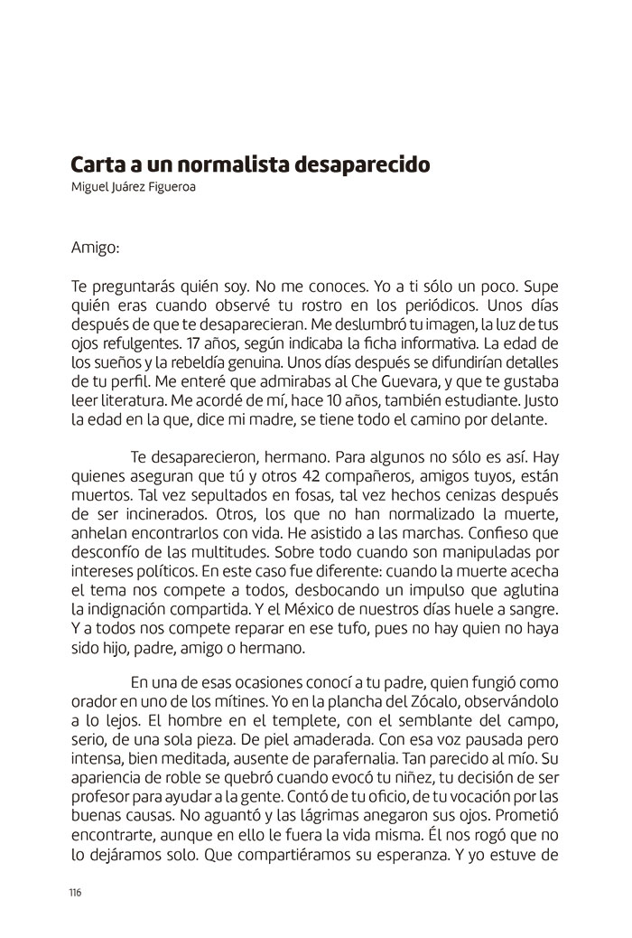 Carta a un normalista desaparecido. ‘Los 43’ Publicado el 26 agosto, 201530 septiembre, 2016 por Miguel Juárez FigueroaDeja un comentario Publicado en ‘Los 43. Antología Literaria’. Editorial Los Bastardos de la Uva, 2015 Compilador: Eusebio Ruvalcaba. La imagen de portada es de Francisco Toledo