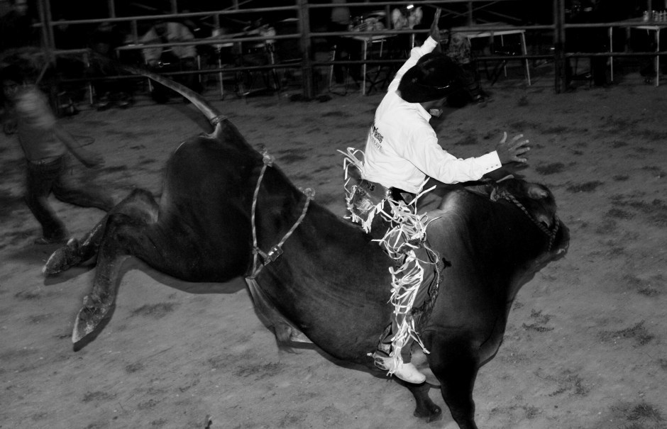 Me encuentro en la coyuntura del jaripeo —uno de los eventos principales de la fiesta patronal del pueblo— y los duelos realizados hasta este momento han levantado un ánimo de fiesta en el público, el cual se muestra amable y juguetón, aunque un poco impaciente. El Niño de Oro de Coixtlahuaca se prepara para montar al toro El Catrín. Hay gran expectativa en las gradas, pues la bestia es famosa —la gente le apoda «el toro que vuela»— y se le ha reservado como el plato fuerte del espectáculo. La música de banda, con su ponderación de los metales de viento (trompeta, trombón y tuba) particulariza aún más el ambiente. La mayor parte de los asistentes bebe con avidez cerveza, tepache o mezcal: como si quisieran potenciar la espera, y llevarla a buen puerto. El jinete despeja la tensión persignándose con un poco de tierra que ha tomado del ruedo. La muerte no es segura, como en las corridas de toros, sino tan sólo una posibilidad, y en este caso no para el animal, sino para el hombre. Al montar, aguanta tres o cuatro reparos antes de salir disparado. Durante esos segundos la bestia y el hombre son uno solo: las venas del animal, hinchadas de energía, parecen conectarse con la arquitectura del jinete (que a pesar de las sacudidas se desenvuelve elegante y soberano). —Capto la fotografía—. Es un espectáculo inocuo y a pesar de eso se intuye un profundo sentido estético que no termino de comprender. La algarabía cunde en los asistentes. Y yo no puedo evitar contagiarme de esa vehemencia.