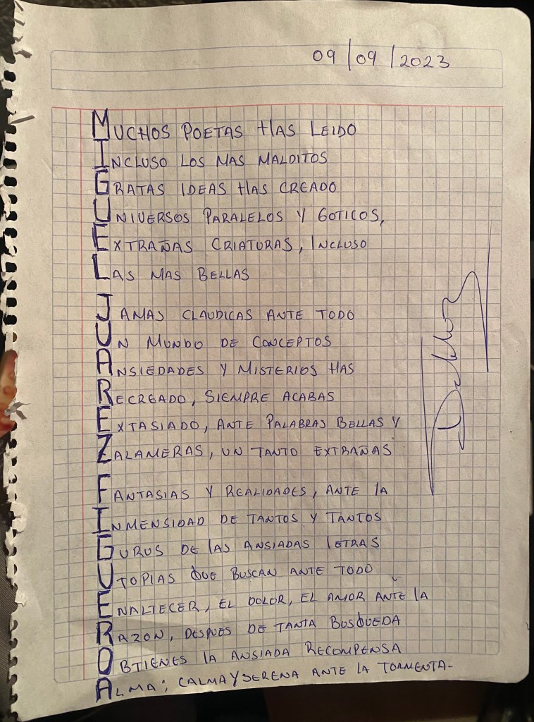 El siguiente acróstico es de la autoría de Isidro de la Luz. Fue escrito y obsequiado durante nuestro internamiento en una clínica de rehabilitación para adictos. En esos pasillos de locura y enfermedad brotaba la amistad y la escritura. Va publicado para dejar constancia y gratitud.